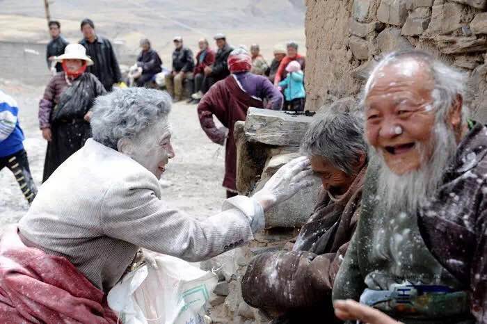 与此同时,快乐的“糌粑大战”便拉开了帷幕。这时,现场所有人可以毫无禁忌,一起相互追逐、抛撒糌粑、见谁撒谁,热恋中的男女青年也可以向自己的心上人抛撒糌粑,在一起狂欢。不一会儿功夫,整个村落及所有在场的人们,无一人会遗漏掉,所有人的脸上、身上已经是粉白一片……